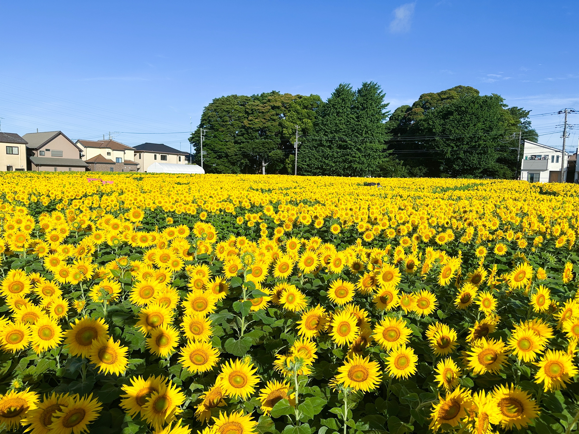 この素晴らしい景観。習志野市藤崎のひまわり回廊である。そもそもここは閑静な住宅街の中にある畑。畑のオーナーの織戸菜園さんが、夏の間の一時期だけ、ひまわりの回廊として畑を無料開放している。(2025年7月27日にてすでに終了)